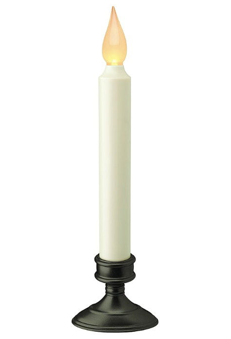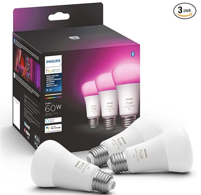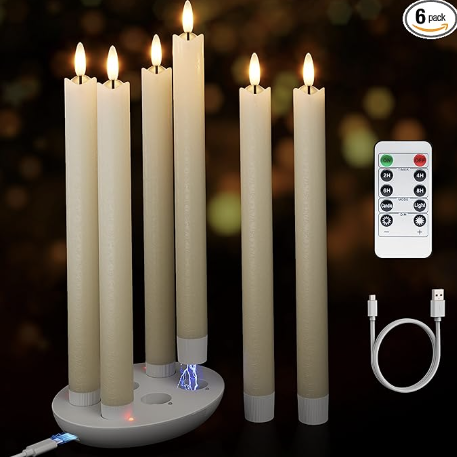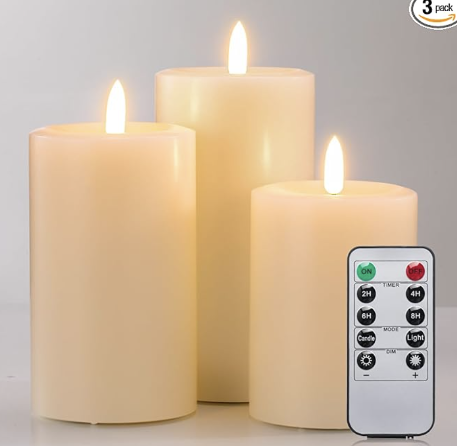 Next, I set the tone for the evening. I turn off all overhead lights and switch on my cozy lighting setup — faux candles, the fireplace, and my Philips Hue bulbs that I control right from my phone. The soft warm glow makes the whole room feel like a cozy little retreat.